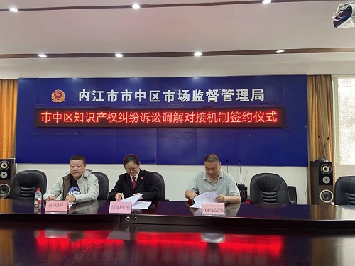 集中宣传活动结束后,内江市市中区市场监督管理局、内江市市中区人民法院、内江市市中区司法局联合签署《内江市市中区知识产权纠纷诉讼调解对接机制》。该《对接机制》确立以调解优先、调解自愿、依法公正、高效便民为工作原则,以激发知识产权创新活力,切实优化法治化营商环境为指导思想,建立信息互通和资源共享长效机制,从召开联席会议、案件移送和办理、信息共享等方面打通知识产权行政保护与司法保护的对接渠道,促进知识产权保护工作的质量与效率。