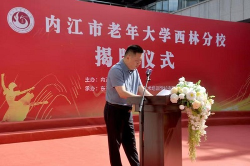 在活动伊始,内江市民政局党组书记、局长刘洪亮在活动上致辞,他指出,我们满怀喜悦相聚在这里,共同见证内江市老年大学西林分校的揭牌仪式。在此,我谨代表市民政局,向出席今天仪式的各位领导、各位来宾表示热烈的欢迎!向一直以来关心支持老年教育事业的朋友们表示衷心的感谢!向西林分校的成立表示热烈的祝贺!他希望,此次内江市老年大学与内投集团携手合作,实现了教育资源与国企力量的深度融合,是创新办学模式、深化校企合作的生动实践。内投集团作为内江经济社会发展的重要支柱,主动践行社会责任,将彩色鱼教育投资公司资源优势转化为服务老年教育的实际行动,充分彰显了国企的使命与担当。内江市老年大学深耕老年教育领域39载,积累了丰富的教学管理经验和优质师资力量。相信在双方的努力下,西林分校一定能够办出特色、办出水平,成为广大老年朋友学习的乐园。