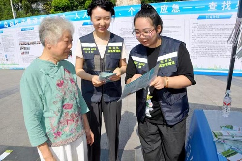 东兴区应急局工作人员(右)向老百姓介绍“防灾、减灾、救灾”等安全知识