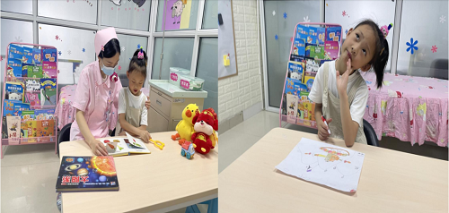护士阿姨带我来活动室玩,这里太好玩了可以画画可以看书还有好多玩具。我偷偷画了一幅画等出院的时候我要送给这里的叔叔阿姨。