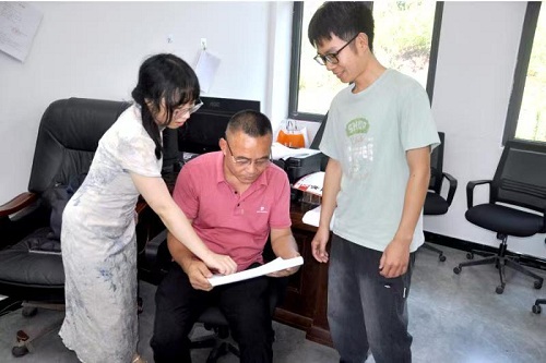 永兴镇党政办主任汤兰(左一)与水口寺村党总支书记谢树元(中)研究“暑期课堂”的教学安排。
