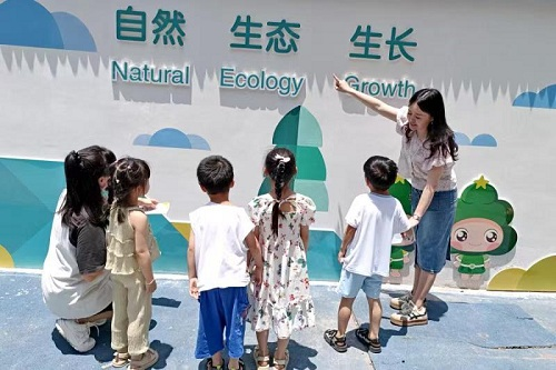 幼儿园领导(右一)带领小朋友在园区参观学习